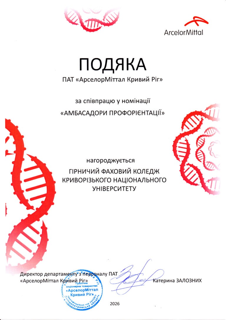 ВСП «Гірничий фаховий коледж Криворізького національного університету» – освітній заклад із 70-річною історією, який готує фахівців у галузях гірництва, будівництва, комп’ютерної інженерії, кібербезпеки, електроніки та економіки.