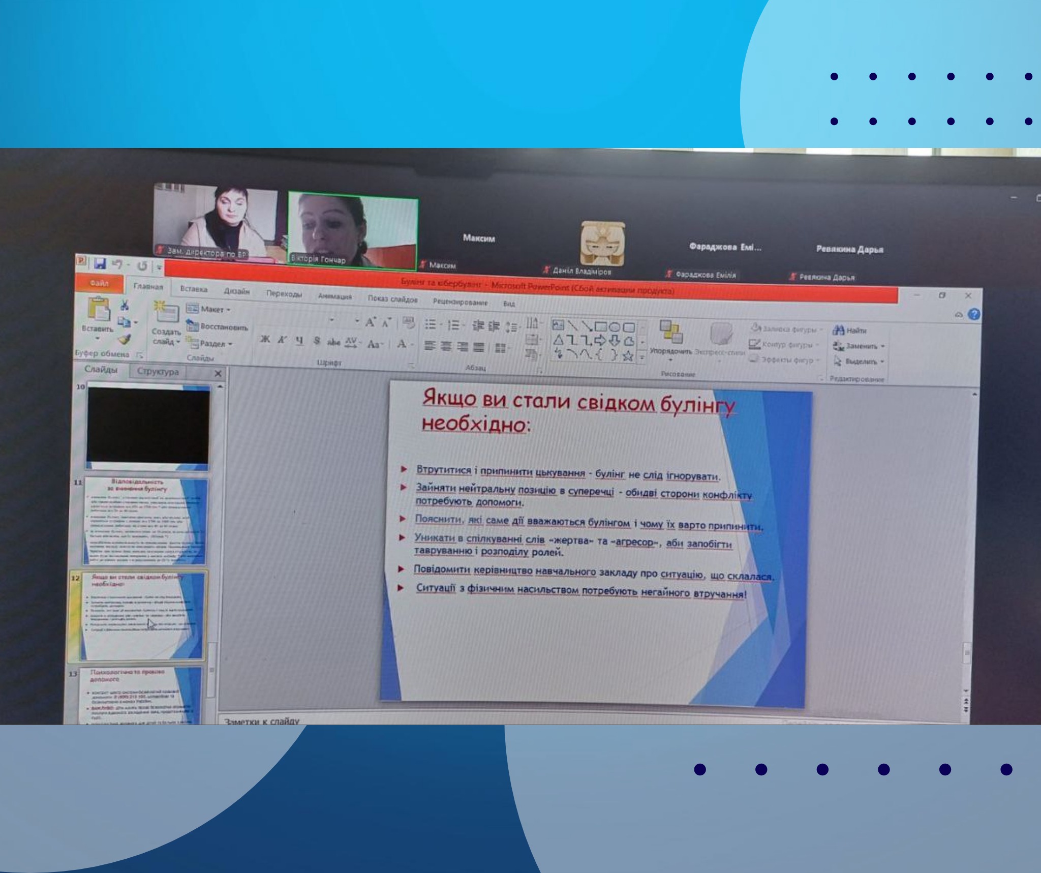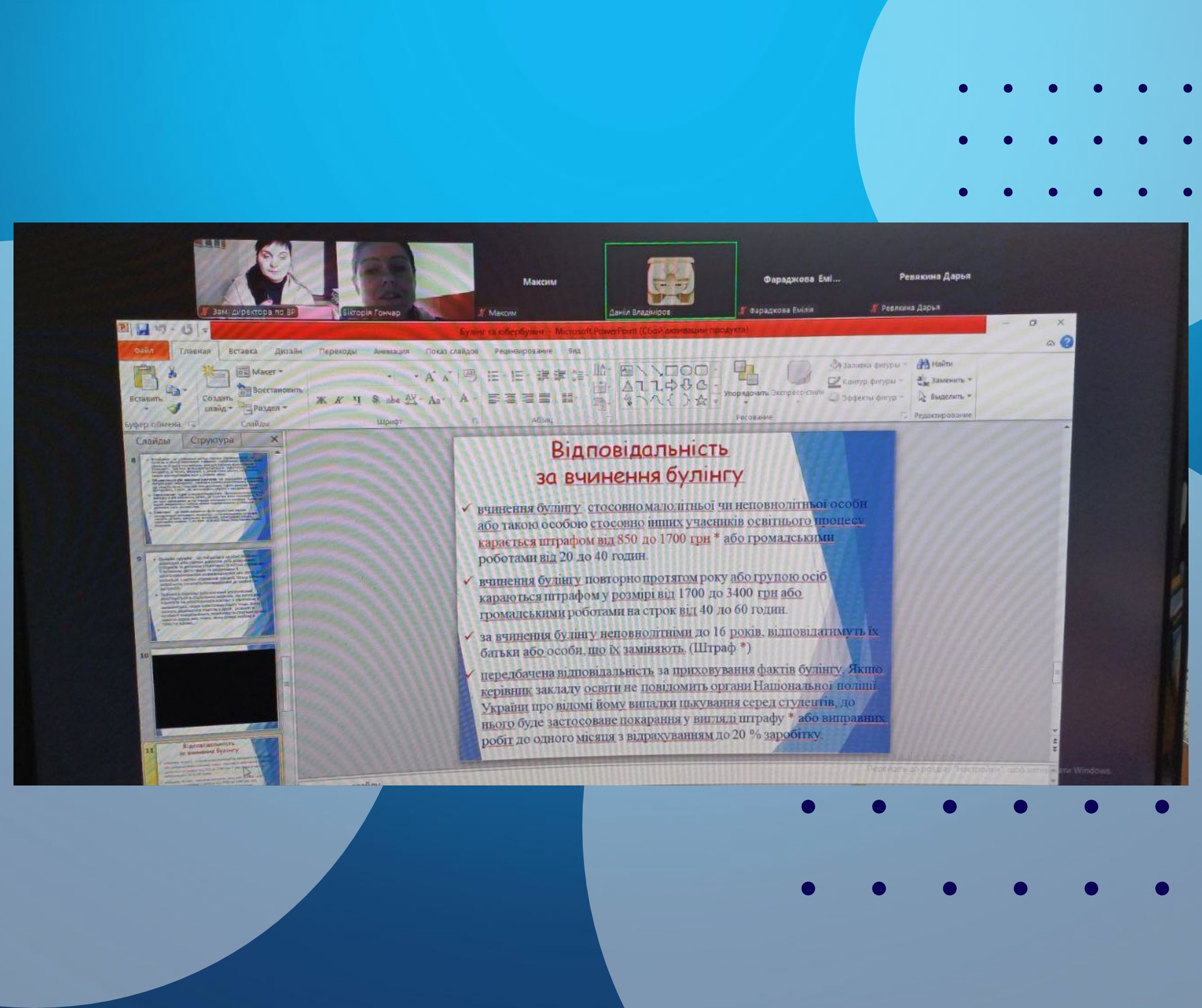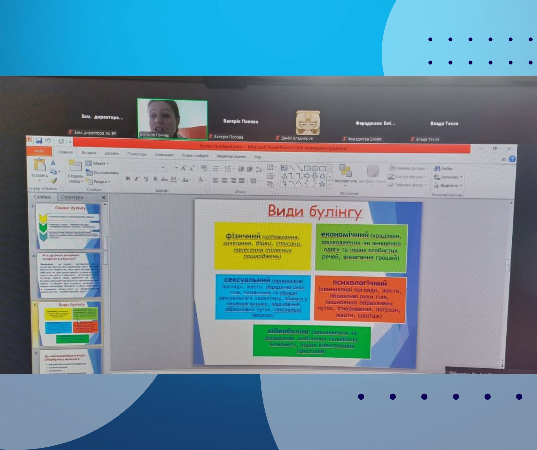 Під час зустрічі здобувачі освіти дізналися більше про поняття «булінг», його основні ознаки та види, а також про те, як відрізнити булінг від звичайного конфлікту . Обговорено типові ситуації проявів агресії серед підлітків , наслідки булінгу для жертви , кривдника та свідків .