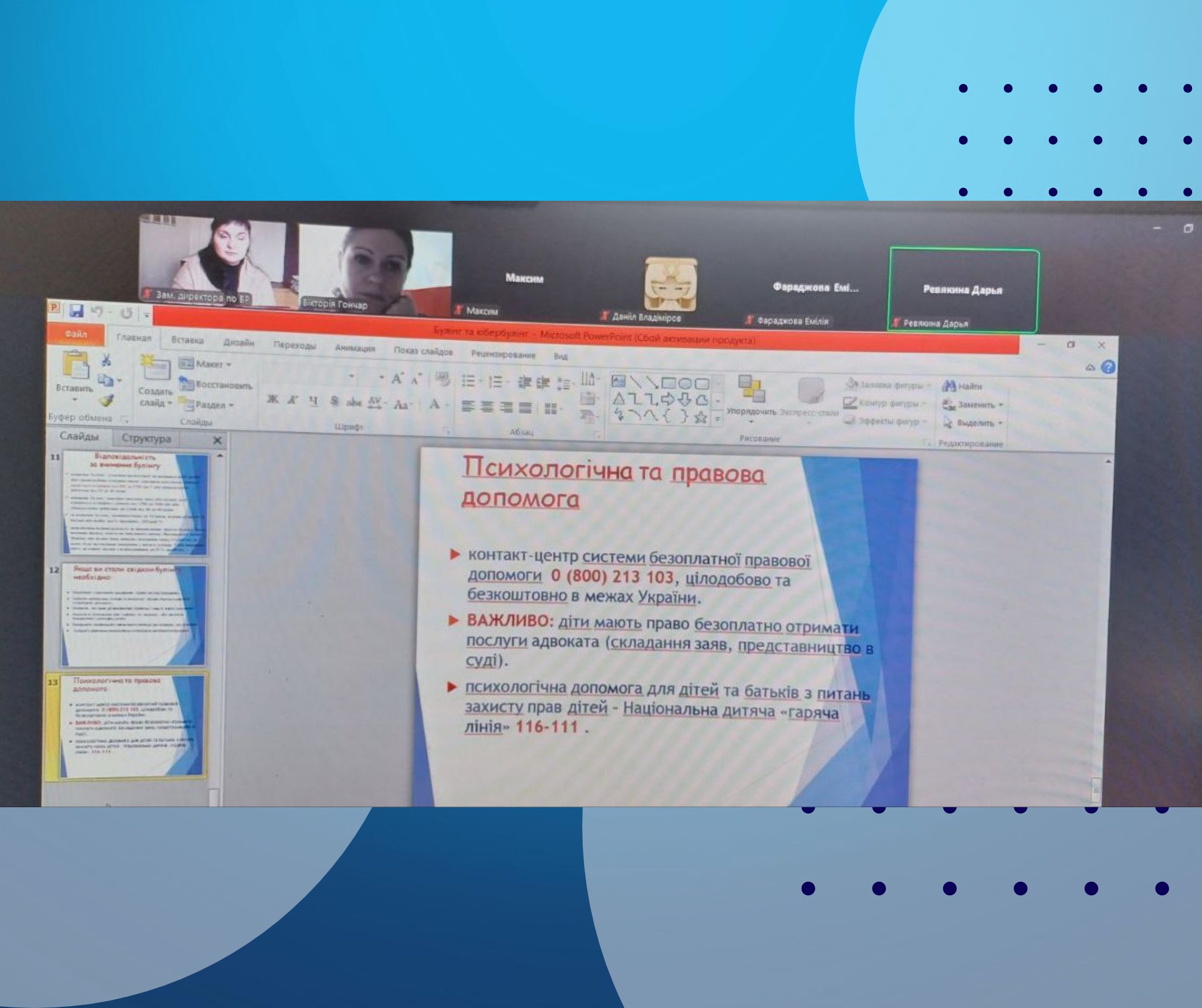 Окрему увагу було приділено питанню кібербулінгу — цькуванню в мережі Інтернет . Під час обговорення розглянуто основні небезпеки онлайн-середовища , а також шляхи захисту від них . Здобувачі освіти отримали практичні поради щодо того, як діяти, якщо стали свідками або жертвами насильства, та дізналися, куди можна звернутися по допомогу .