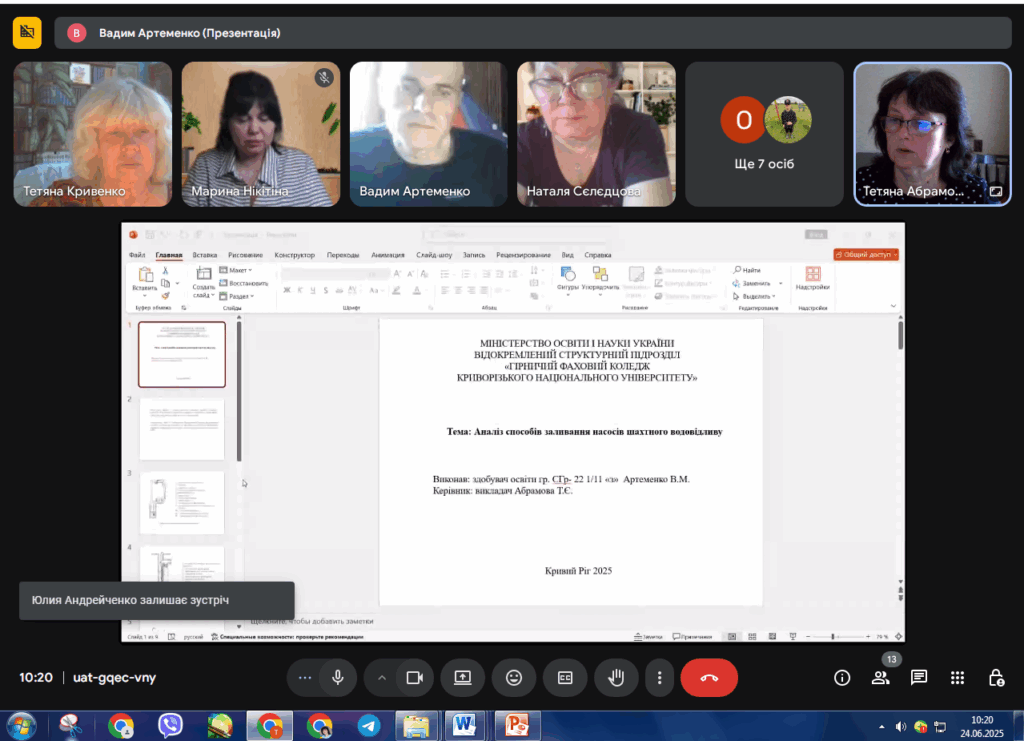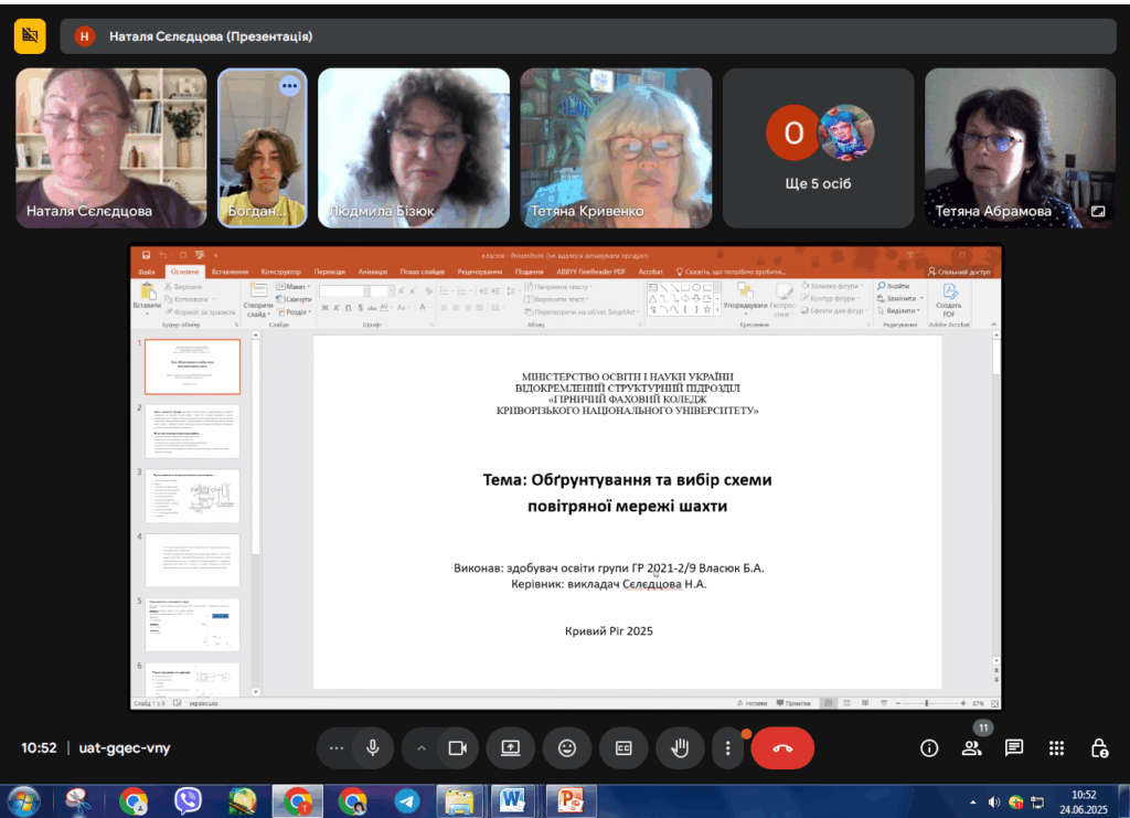 29.04.2025 в групі ГР-22 1/9 відбувся захист курсової роботи з дисципліни «Монтаж та ремонт гірничого обладнання» (керівник викладач спеціальних дисциплін Абрамова Т.Є.). Під час захисту здобувачі освіти представили свої курсові роботи та доклади, які супроводжувались демонстрацією презентації, а також відповідали на запитання, які було поставлено представниками комісії.