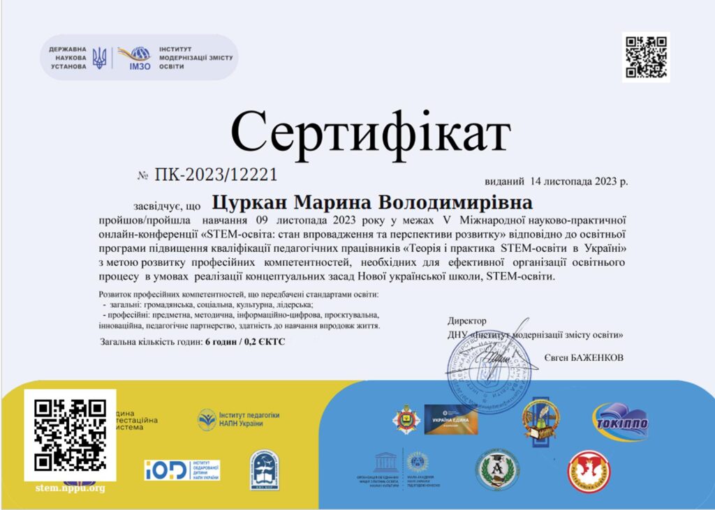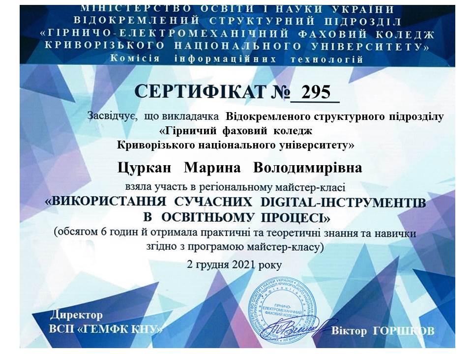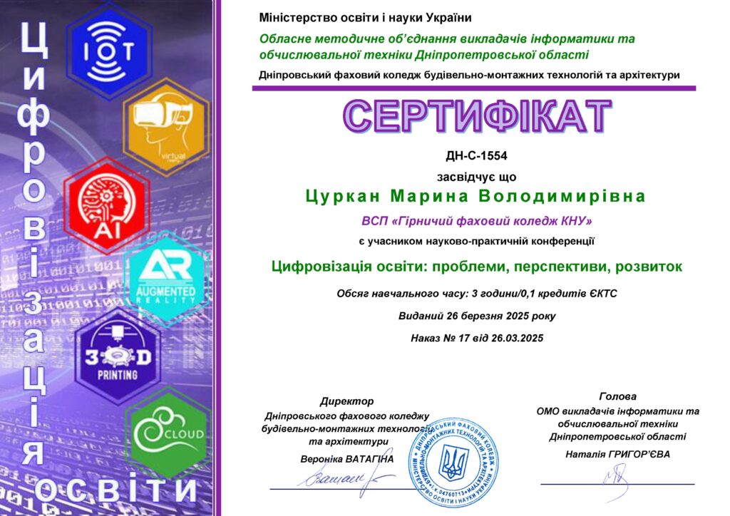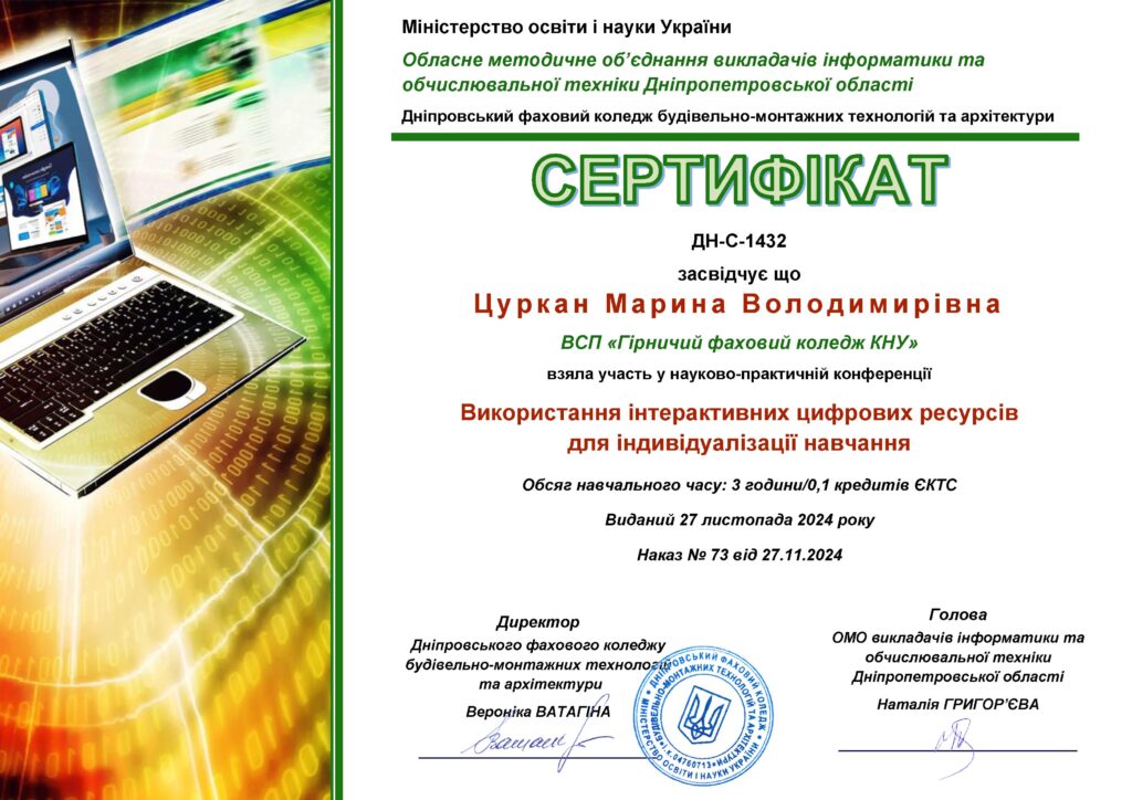 інженер-педагог з комп’ютерних технологій, педагог-дослідник, професіонал у галузі комп'ютерних технологій, спеціаліст вищої категорії