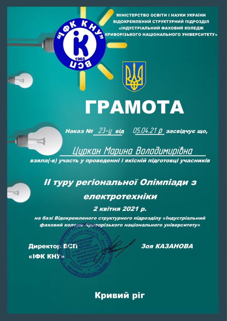 інженер-педагог з комп’ютерних технологій, фахівець в галузі електроніки та телекомунікацій, спеціаліст вищої категорії, старший викладач