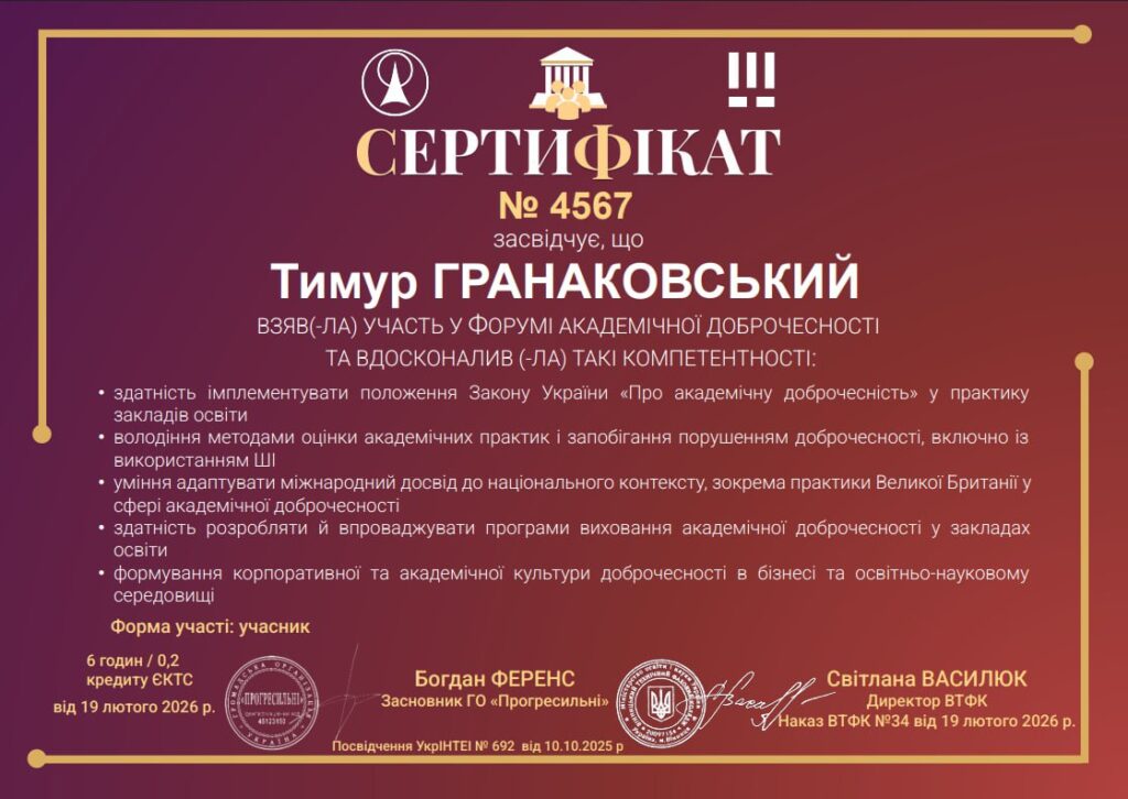 Серед спікерів — провідний експерт з академічної доброчесності Артем Артюхов, команда проєкту Вінницького технічного фахового коледжу, представники ВСП “Машинобудівний фаховий коледж” СумДУ, керівники ЗФПО, представники МОН, ДСЯО, ГО «Академія менеджменту якості та інновацій», ГО «Прогресильні» та освітяни з усієї України.