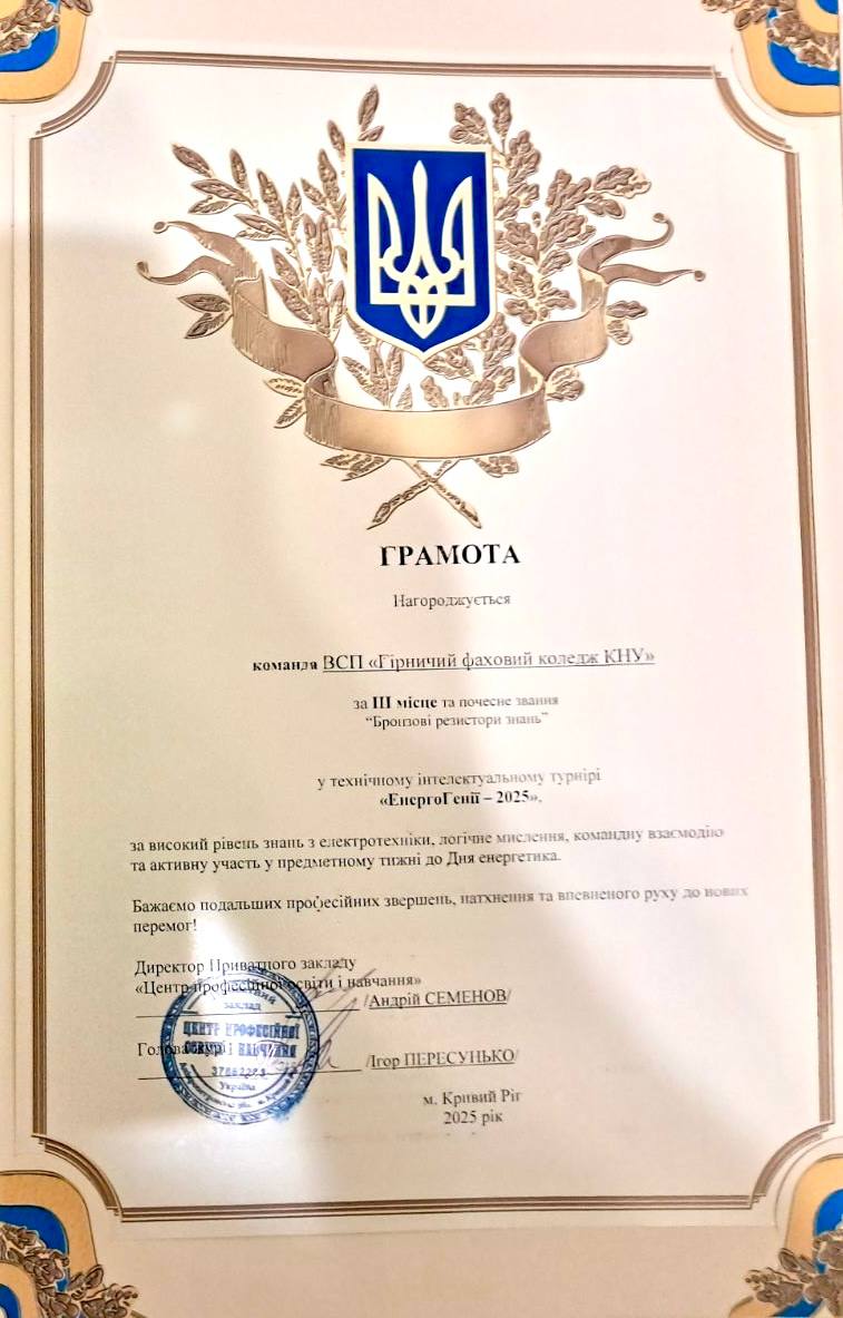 У межах предметного тижня до Дня енергетика 17 грудня відбувся технічний інтелектуальний турнір «ЕнергоГенії-2025». Захід був організований Приватним закладом «Центр професійної освіти і навчання» спільно з Науково-дослідним гірничорудним інститутом Криворізького національного університету.