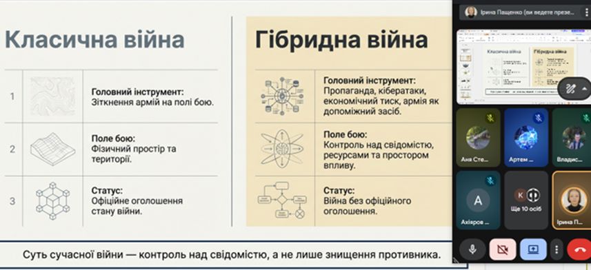 Під час заходу здобувачі освіти ознайомилися з особливостями гібридної війни, її проявами в сучасному світі та роллю українського суспільства у протидії інформаційним, військовим і психологічним загрозам. Особливу увагу було приділено формуванню національної свідомості, єдності та стійкості як ключових складових опору.